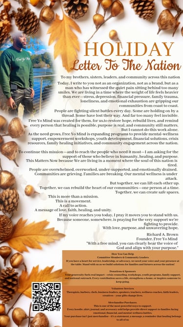 Free Yo Mind exists to restore hope, strengthen mental wellness, and uplift individuals and families through transformative programs that meet people exactly where they are. Each initiative is intentionally designed to address emotional, spiritual, and psychological needs across all ages and life experiences ensuring no one walks their journey alone.